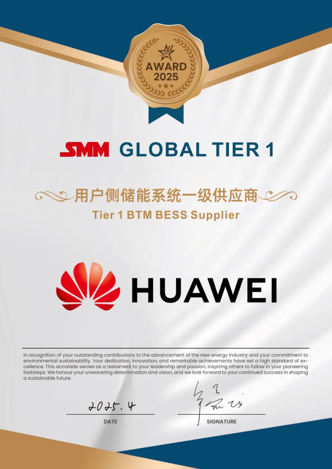【中国,上海,2025年4月29日】近日,华为数字能源凭借在储能系统领域的技术创新能力、全球化市场布局、完善的服务体系、长期的ESG贡献等,荣获SMM Tier 1储能系统供应商认证,这一荣誉是对华为数字能源的科技创新成果和全球领先地位的认可与肯定。